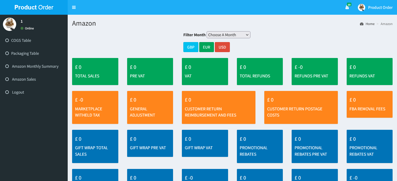 See your Total Sales, PRE Vat, Vat, Total Refunds, Refunds Pre Vat, Postage Cost , PROFIT , MARGIN and many more.